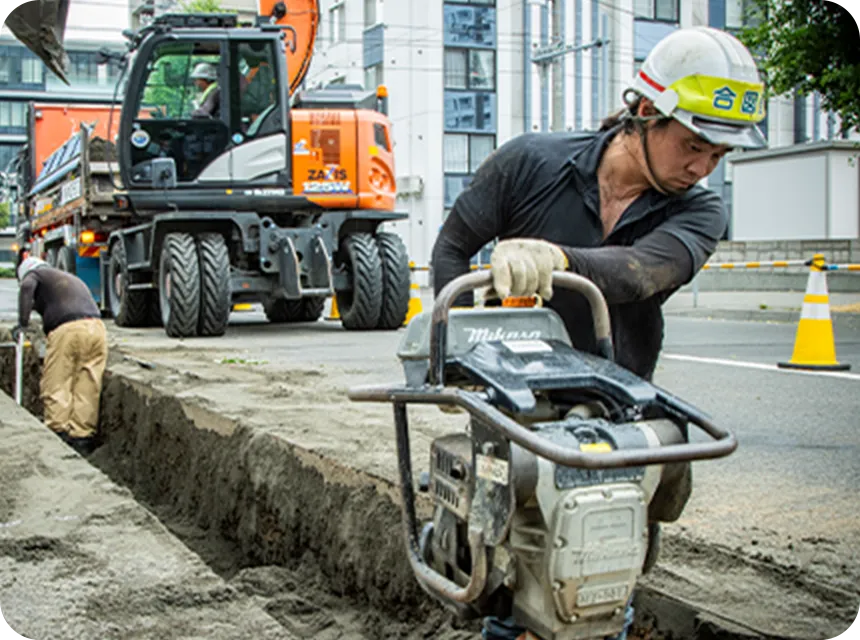 札幌近郊で、道路の下にガス管を通し、各家庭や建物までつなぐ工事を日々行っています。